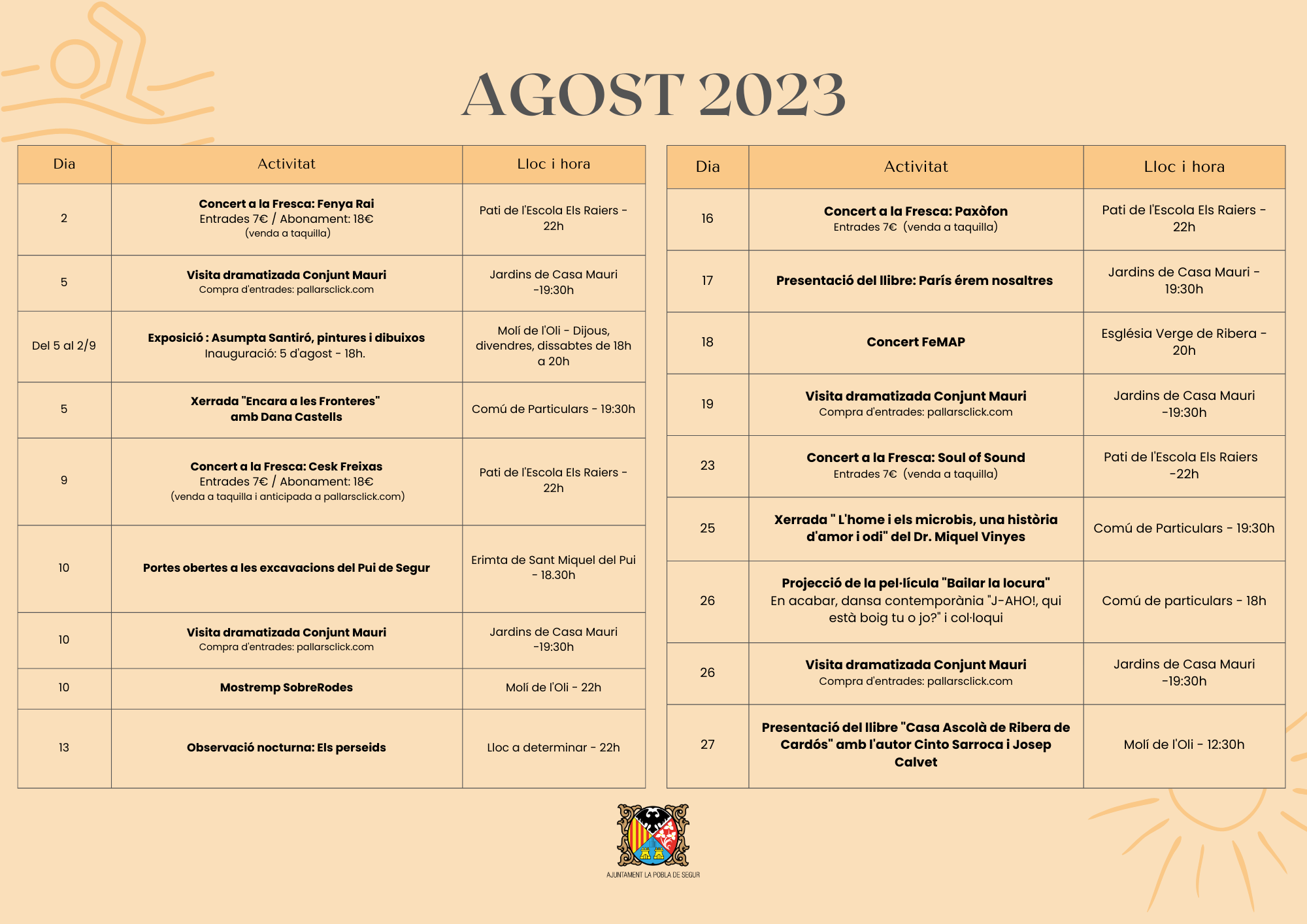 Aquest mes d’agost podreu gaudir d’una gran varietat d’activitats culturals al nostre poble. Trobareu concerts, xerrades, visites guiades i exposicions durant tot el mes.